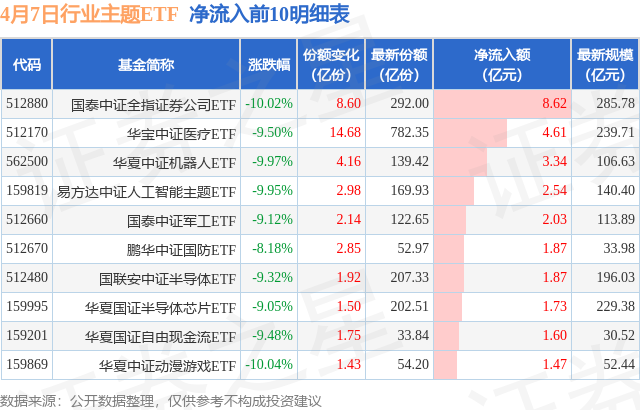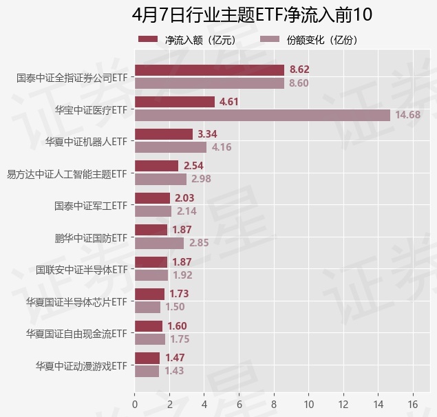 当日有247只行业主题ETF基金出现资金净流入,其中净流入排首位的是国泰中证全指证券公司ETF(512880),份额增加了8.6亿份,净流入额为8.62亿元。