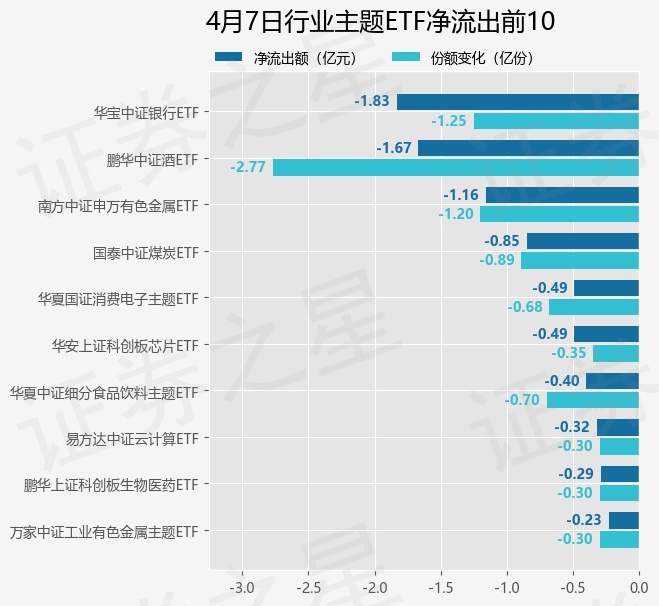 当日有44只行业主题ETF基金出现资金净流出,其中净流出排首位的是华宝中证银行ETF(512800),份额减少了1.25亿份,净流出额为1.83亿元。